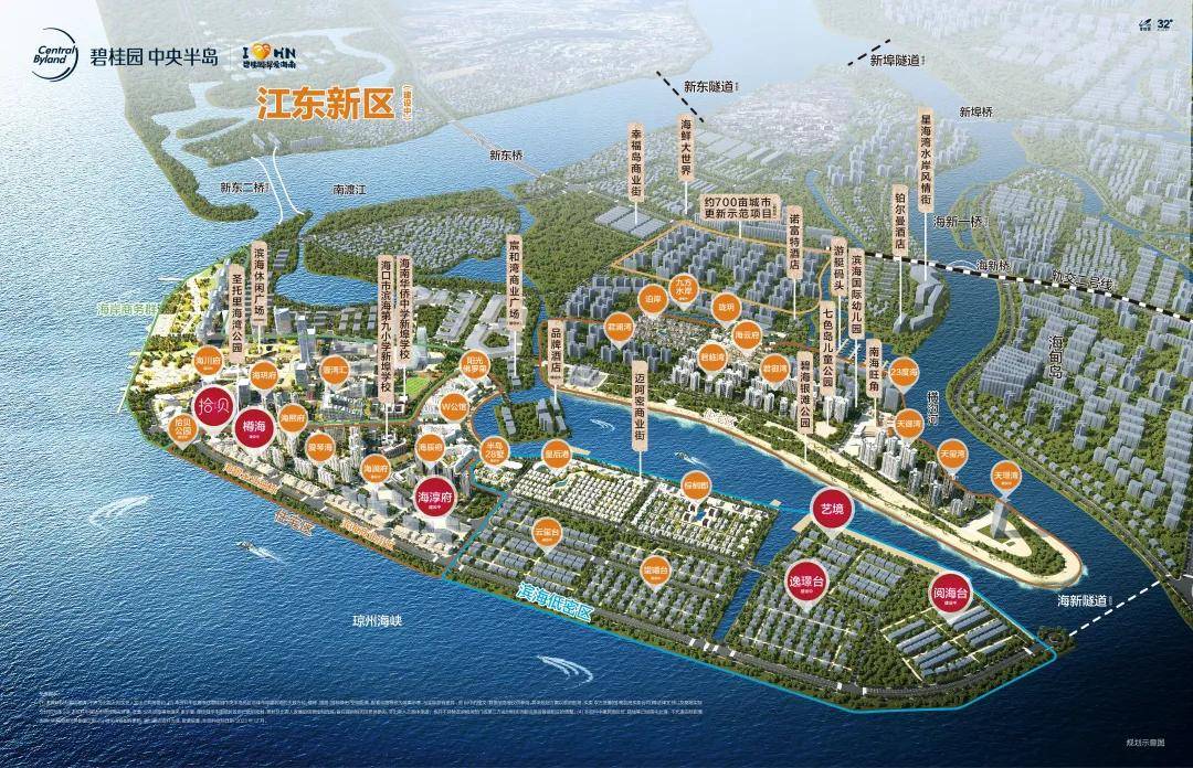 碧桂园中央半岛位于海南省海口市新埠岛北端,北望琼州海峡,三面环江,一面临海,有丰富的江、海、湾景观资源。项目整盘规划,潜心打造七大生态都市系统,共计开发44个苑区(部分规划中),截止2024年已交付18个苑区,交付逾8000户房屋。“拾贝”销售中心及“拾贝”公园,为海口热门打卡目的地。